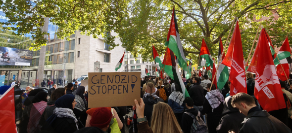 Angemeldet worden war die Demo unter der Überschrift "Solidarität mit der Sumud Flotilla - Stoppt den Gaza Genozid - Keine Waffenlieferungen an Israel". Unter "Sumud Flotilla" wird der Schiffskonvoi mit Hilfsgütern für Gaza verstanden, der mittlerweile fast komplett von Israels Marine gestoppt wurde.